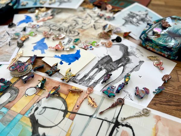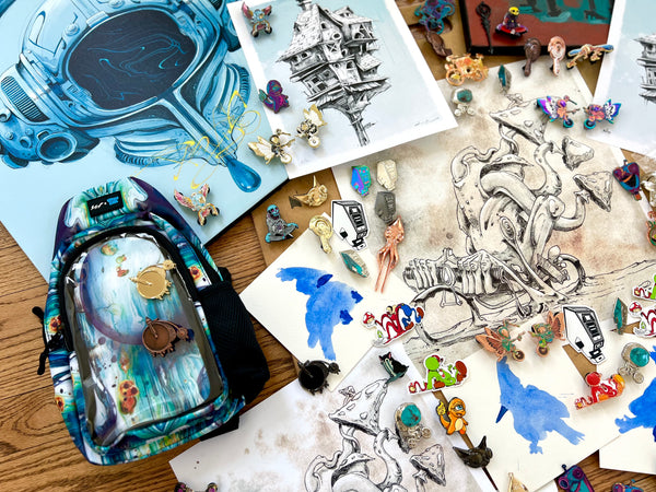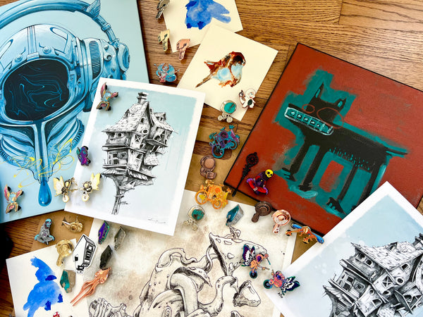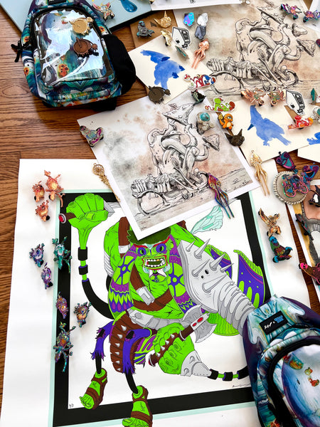 PINS! HAND PAINTED PINS! RAW PINS! PRINTS! HAND EMBELLISHED PRINTS! ORIGINALS! CANVAS! BAGS!